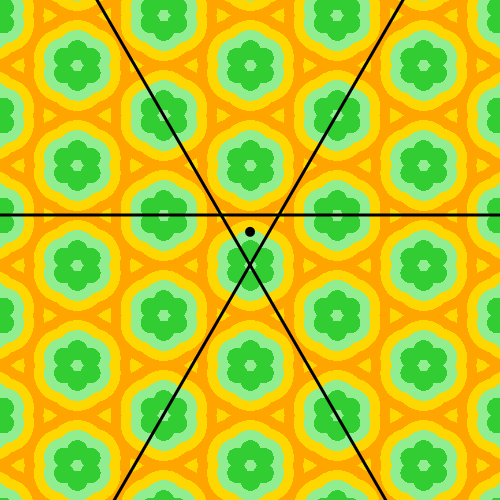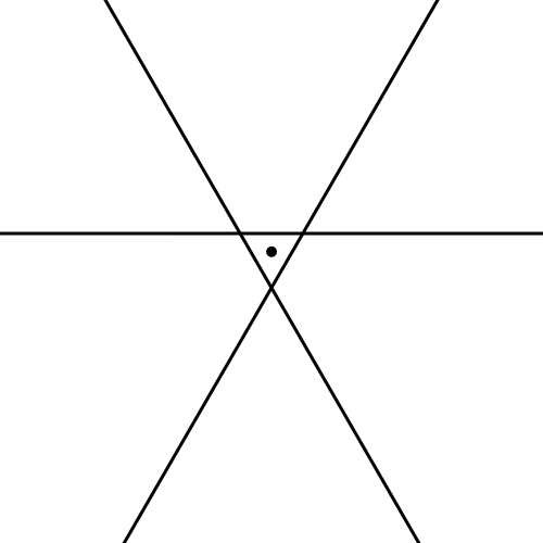 Let's draw three infinite lines enclosing an equilateral triangle. This triangle is called the "fundamental domain", and we assume that it contains the point [0,0].