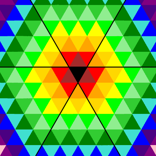 The IIS function counts how many reflections are needed to move from the point [x, y] to the corresponding point in the fundamental domain (the black triangle). It looks nice, but a bit flat! Let's modify step 5 of the IIS function as follows: